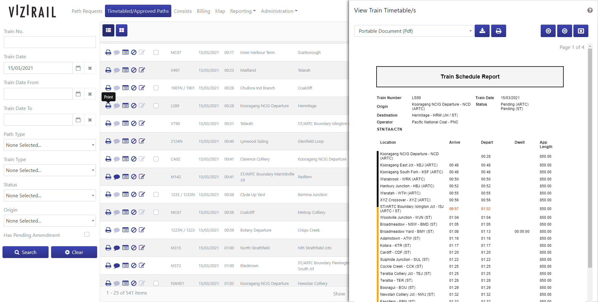 Timetable paths are confirmed, cancelled or amended by the operator and communicated to the RIMs. The complete train journey of approved ad-hoc services and timetable paths are viewed on a train report and available to download or print.
