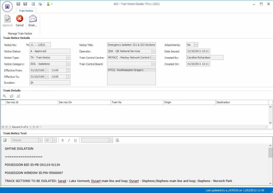 A Train Notice is used to notify personnel of changes to Train Schedules, track maintenance, ad hoc traffic, service cancellations, special events, re-pathing of services and other changes arising up to and during the day-of-operation. Authorised users create train notices based on the Short Term Plan for publication to specific users or all system users. Train Notices are created within specific Categories and Types, and issued within specific date ranges. Train Notice types include Maintenance Notices, Safety Notices and Possession Notices.